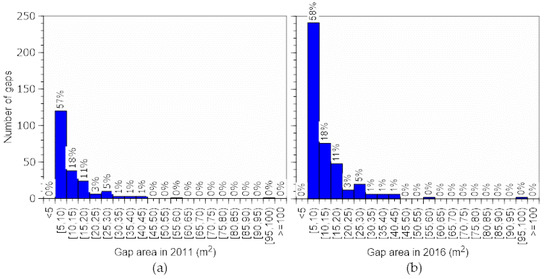 Number of gaps. New gaps by area class (a) between 2005 and 2011 (period A) and (b) between 2011 and 2016 (period B).