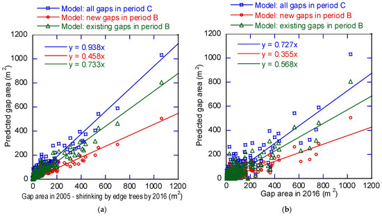 Among the three models, the gap reduction model (10) for period C predicted the slowest closure (Figure 10a). Model (10) was created by using new and existing gaps for periods A and B for a longer period than period A and B. Model (10) predicted gap reduction more accurately than models (11) and (12), which were based on shorter periods. Since tree crown size has a limit, reduction speed by canopy expansion is expected to decrease with time. When factors (a), (b), and (c) (Figure 10b) were included, the regression slope in the model verification was ~0.77 times the slope when only factor (a) was considered (Figure 10a). This means that the main factor in gap reduction was the lateral growth of gap edge trees (a), but that understory vegetation growth (b) and gap expansion (c) also affected gap dynamics considerably.