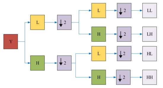 Applying discrete wavelet transform on the input data leads to the approximation and detail components. The input data may go through the low pass (LP) and high pass (HP) filters. Then, there exists a down-sampling right after performing the filtering. In this stage, the filtered down-sampled signal would be the input data, which again need to be passed through the LP and HP filters [,]. This procedure continues until we get four sub-bands, namely, LL, LH, HL and HH, as can be seen from Figure 1. H represents the high frequency, and L denotes to low frequency.
