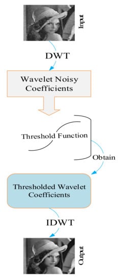 Wavelet-based image de-noising can be performed as follows [], []. Applying a wavelet transform provides us with the wavelet detail (important or significant) and noisy (non-important) components. It is obvious that the important features of the image need to remain, and the non-important characteristics need to be discarded. Therefore, we can apply a suitable threshold function to do so. The threshold function can easily tune the wavelet components by the threshold value. By applying the threshold function, we will obtain the thresholded wavelet constituents. In order to obtain the output de-noised image, we are required to apply the inverse discrete wavelet transform (IDWT). This de-noising process is shown in Figure 2.