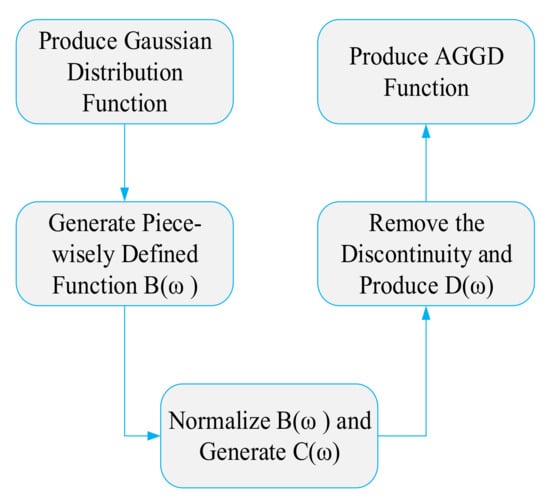 Although optimization-based noise reduction could solve some drawbacks of utilizing the TNN, the quality of the de-noised image needs to be improved, and the computational time also needs to be decreased. In 2019, an adaptive generalized Gaussian distribution (AGGD)-oriented threshold was proposed for image de-noising []. The process of acquiring this data-driven function is formulated below []. This procedure is illustrated in Figure 4.