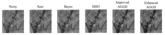 In the first experiment, as can be seen from Table 1, a comparison has been made between the proposed technique with improved AGGD [], HHO [], Bayes [] and Sure [] in terms of PSNR values for different standard deviations. The results indicate that the proposed enhanced AGGD performed better than other techniques. Here we have utilized five satellite images.