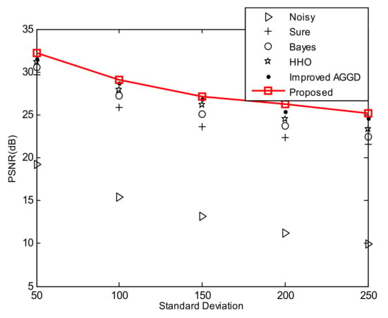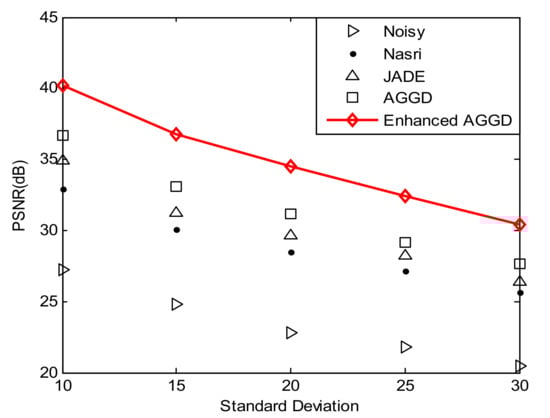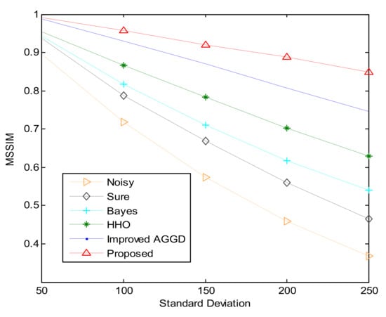 Furthermore, in this experiment, we compared the enhanced adaptive-based noise reduction method (proposed method) with the improved AGGD [], HHO-based noise reduction, Bayes [] and Sure [] for larger values.