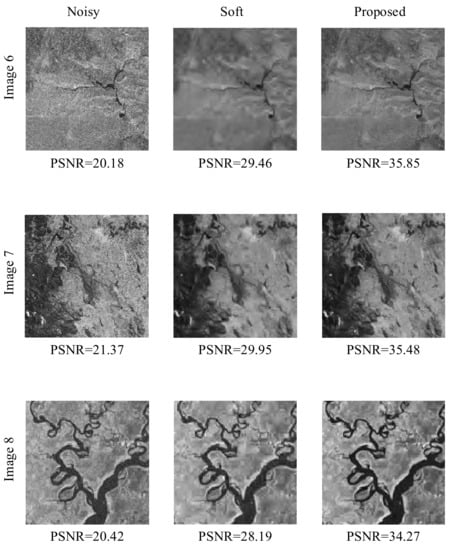 Noise removal based on wavelet transform has become very popular in image processing. Various noise reduction approaches have been developed in the wavelet domain. Adapting to unknown smoothness via wavelet shrinkage was introduced in 1995 []. Chang et al. in 2000 [] proposed spatially adaptive wavelet thresholding-based noise removal with context modeling.Figueiredo and Nowak (2001) utilized Jeffrey’s noninformative prior, combined with an empirical Bayes approach for wavelet-based image estimation []. A novel Bayesian multiscale method for speckle noise suppression in medical ultrasound images was introduced in 2001 []. Image de-noising based on curvelet transform has been proposed by Stark et al. (2002) []. The bivariate shrinkage function for noise removal in the wavelet domain was proposed by Sendur and Selesnick (2002) []. Chang et al. (2000) [] presented image de-noising and compression using adaptive wavelet thresholding. Sveinsson and Benediktsson in 2003 [] introduced the speckle noise removal of SAR images using almost translation-invariant wavelet transformations. Achim et al. (2003) proposed SAR image de-noising via Bayesian wavelet shrinkage based on heavy-tailed modeling []. Hyperspectral remote sensing noise reduction with 3D UWT using a new, improved soft thresholding function has been presented in 2018 []. Pižurica et al. (2002) proposed Bayesian wavelet-based noise removal using a joint inter- and intrascale statistical model []. Translation invariant wavelet-based noise reduction with smooth sigmoid-based shrinkage (SSBS) function and un-decimated wavelet transform (UWT) utilizing a soft thresholding function has been proposed in Refs. [] and [], respectively. Li et al., in Ref. [], presented an approach for hyperspectral image de-noising using non-local low-rank and TV regularization. Additionally, low-rank tensor approximation combined with robust noise modeling has been proposed in Ref. [] for remote sensing image de-noising.