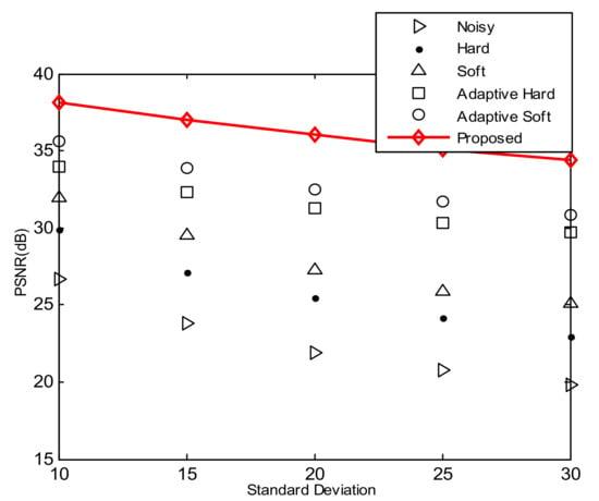 In the third experiment, we used test Image 5 to compare the performance analysis of the proposed enhanced AGGD technique with adaptive soft and adaptive hard [], and standard soft and standard hard, threshold functions for . As can be seen from Figure 12 the results show that the proposed method outperforms other methods in terms of PSNR value.