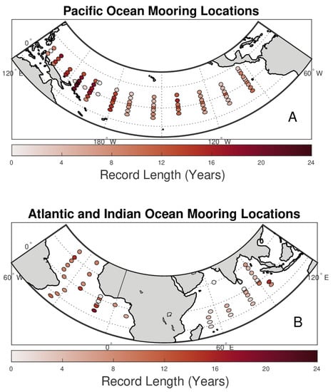 The Global Tropical Moored Buoy Array. (A) The array is called “TAO” in the eastern and central Pacific, “TRITON” in the western Pacific, (B) “PIRATA” in the Atlantic and “RAMA” in the Indian ocean. Note, some sites are not currently operational, especially in the western Pacific. Symbol colors correspond to the length of the record in years, with a scale at the bottom. The record length refers to the total number of hourly measurements regardless of gaps.