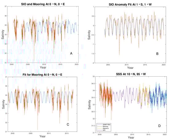 Another issue to consider when interpreting the results presented here is the depth dependence of upper ocean salinity, and how it is measured. There is a mismatch of sampling between these three measurement systems in depth. Satellites measure the skin surface value, the upper 1–2 cm. Argo floats, from which the EN4 and SIO products are mainly derived, usually do not measure above 5 m depth [15]. The topmost salinity sensors on the GTMBA buoys are positioned much closer to the surface, at a depth of ~1 m [35]. The issue of depth dependence of upper ocean salinity has been explored in many previous papers [15,46,47,48,49,50]. What impact might this different sampling have had on the results presented here? The moorings, having sensors close to the surface, give a better estimate of near surface values than Argo floats would. Studies like Drushka et al. [43] have shown that rain anomalies do tend to get concentrated in the upper meter of the ocean surface. Such anomalies are present in the mooring time series like those displayed in Figure 2A. On the other hand, the large footprint of SSS satellites would tend to suppress short time scale, rain-induced SSS anomalies. So, one would guess that the mooring time series will be able to capture very low values during rain events that might not be present in the footprint-averaged satellite values or the gridded in situ data. This effect is quite visible in Figure 2D. This could potentially lead to the mooring data having larger seasonal amplitudes than the other two types of data as low outliers during rainy seasons influence the harmonic analysis we have done here. However, this does not seem to be the case, at least for most of the products (Figure 9B–D and Table 2).