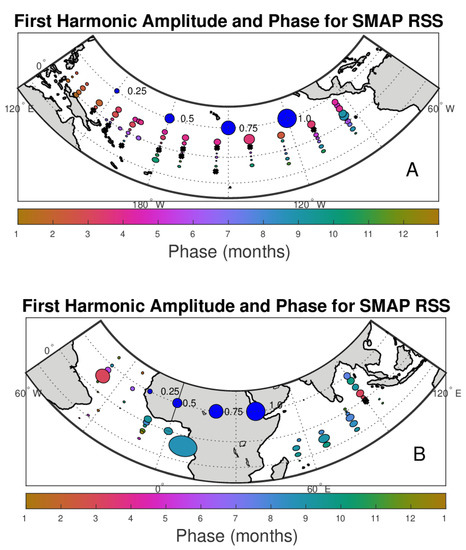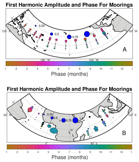 The annual harmonics for the moorings (Figure 3) indicate a variety of amplitudes and phases. The largest amplitude, ~1.0, is near the west coast of Africa in the vicinity of the outlet of the Congo River. Other areas with large amplitude are in the Amazon River outflow in the western Atlantic, the western tropical Indian Ocean south of the equator and along 10°N in the North Pacific. The sizes of the harmonics shown match well with previous reported values [17,18,19,20]. Phases show maximum SSS in the northern hemisphere mostly in February–May and in the southern hemisphere in July–December (this will be shown more clearly below). There are some exceptions to this general pattern. The Bay of Bengal for example, has maximum SSS in October, and some far eastern North Pacific moorings also have a maximum SSS in October.