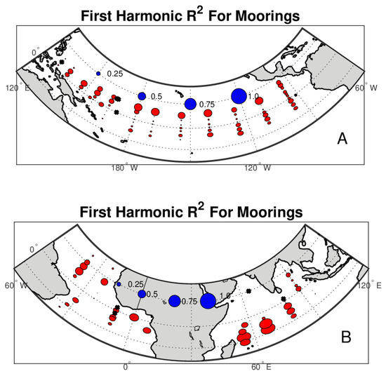Next, we show maps of fraction of variance, R2, explained by the harmonic fit (Figure 4). In the Pacific basin, the numbers tend to be larger, over 0.5, in the ITCZ, in the western Pacific and south of the equator in the eastern Pacific, whereas they are small along the equator. In the Atlantic most of the values are large, especially near the coast of Africa. In the Indian basin, the values get very large, approaching 1 in the western South Indian basin. All of these results indicate that in many parts of the tropical ocean, the seasonal time scale represents a large fraction of the total signal [20,21].