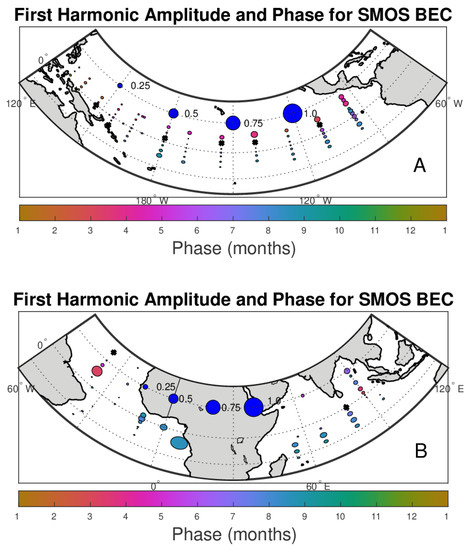 As in Figure 3, but for the SMOS BEC data. (A) Pacific basin. (B) Atlantic and Indian basins.