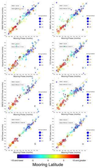 Scatterplots of first harmonic comparison product phase (month of maximum SSS) vs. mooring phase. Each symbol is for one mooring, with symbols plotted only where there is a significant annual fit for both the moorings and the given product. The number of symbols in each plot is given for each product in Table S6. Colors of symbols indicate latitude of mooring with scale at bottom. Sizes of symbols indicate mooring amplitude with scale at right in solid blue in each panel. A light black line shows a one-to-one correspondence. Boxes in each panel show root mean square differences (RMSD) and median difference (mooring-comparison) in months. Products compared are (A) SMAP RSS, (B) SMAP JPL, (C) Aquarius, (D) CCI, (E) SMOS CATDS, (F) SMOS BEC, (G) EN4, (H) SIO.