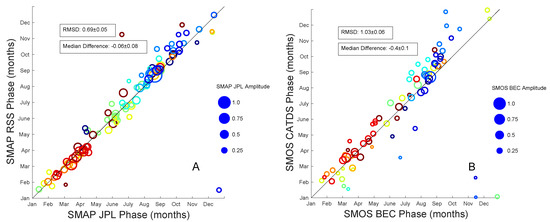 As in Figure 7. Comparisons are (A) SMAP RSS vs. SMAP JPL and (B) SMOS CATDS vs. SMOS BEC.