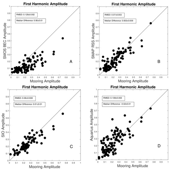 Scatterplots of first harmonic amplitude vs. mooring amplitude. A light black line shows a one-to-one correspondence. Boxes in each panel show RMSD and median difference (mooring-comparison). Comparison amplitudes are (A) SMOS BEC, (B) SMAP RSS, (C) SIO, (D) Aquarius. For completeness, all first harmonic amplitude comparisons are shown in the supplemental materials (Table S3).