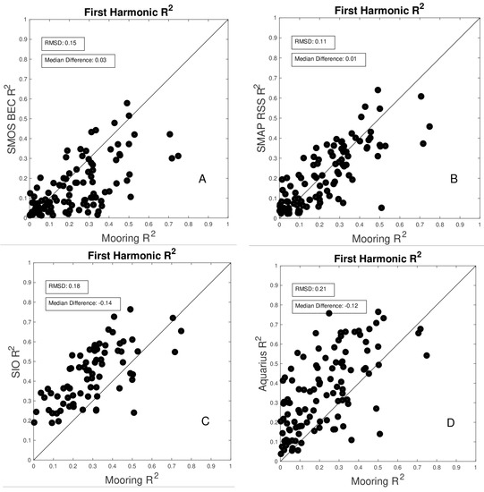An example set of R2 comparisons are shown (Figure 10; Table 3). These examples were chosen to illustrate each of the satellites and one gridded in situ product. The value of R2 is a function of the temporal sampling of each dataset, and the footprint of the satellite or grid size of the in situ product. Overall, in the tropics the annual harmonic only comprises about 20% of the total variance of SSS for the moorings (Table 3). The moorings, one assumes as they are sampled hourly, capture all or almost all of the temporal variance in nature. The gridded in situ datasets (EN4 and SIO) are averaged monthly and over a 1° × 1° area, so any variance with smaller time and space scales is not present in those datasets. Thus, one would expect R2 in the annual harmonic to be larger for these than for the moorings, which it is (Figure 10C; Table 3). For Aquarius, the issue is the same. It has a footprint similar in size to the in situ products’ grids, generating an average over about a 100-km area. Thus, it does not sample most of the variability at less than 100 km in size. As much of ocean SSS variance is at sizes less than 50 km [44], the Aquarius dataset cannot resolve it, and therefore, the annual harmonic constitutes a larger fraction of the variance than for the moorings (Figure 10D; Table 3). As we have seen, the SMOS BEC data underestimate the size of the annual harmonic, and so the fraction of variance captured in that dataset is less than for the moorings (Figure 10A; Table 3). Finally, the SMAP RSS product (Figure 10B; Table 3) has a smaller footprint than Aquarius, and more frequent sampling than SIO. The fraction of variance depicted in that dataset is comparable to that of the moorings. The datasets not plotted in Figure 10, SMOS CATDS, SMAP JPL, EN4 and CCI, all show similar patterns as SMAP RSS (Table 2).