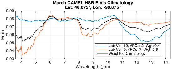 Similar to the monthly CAMEL HSR emissivity product, the CAMEL HSR emissivity climatology is provided as PC coefficients, lab datasets, and software routines in either FORTRAN or Matlab. This method is used to reduce the file sizes of the product. When computing the mean climatological HSR PCs, coefficients corresponding to each unique combination of number of PCs and lab dataset version are kept separate. Table 2 lists the unique combinations of number of PCs and lab versions used in the CAMEL V002 product. Since there are seven unique combinations, a theoretical maximum of seven different PC vectors could be included for one pixel of the climatology. However, due to minimal interannual variations in land cover over a single pixel (e.g., due to vegetation or snow cover change), typically only a maximum of 2 and sometimes 3 or 4 are used for a single pixel and calendar month over the full extent of the CAMEL record. From the averaged climatological PC vectors, corresponding CAMEL HSR emissivities can then be computed. The HSR emissivities are then averaged together using weights which are based on the number of samples of each unique combination. These weights are included in the PC climatology files. Figure 1 illustrates the process of computing the mean HSR emissivity climatology for March over a partially snow covered scene in northern Wisconsin, USA. For this particular pixel and month, only two unique combinations of number of PCs and lab version are used—lab version 12 with 2 PCs and lab version 9 with 7 PCs, having the respective weights of 0.4 and 0.6. Figure 1 shows the two intermediate HSR spectra in color which represent lab version 12 with 2 PCs and lab version 9 with 7 PCs, as well as the final HSR emissivity climatology in black, which is the weighted average of the intermediate spectra.