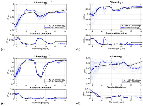 April 2000–2016 CAMEL 13 hinge-point monthly (grey) and climatology (black) emissivity overlaid with the HSR monthly (light blue) and climatology (blue) emissivity (top row), and standard deviation over the same years (bottom row) shown for the (a) Atmospheric Radiation Measurement (ARM) Southern Great Plains (SGP), (b) Yemen, (c) Namib, and (d) Rocky Mountain, Mt. Massive case site.