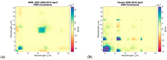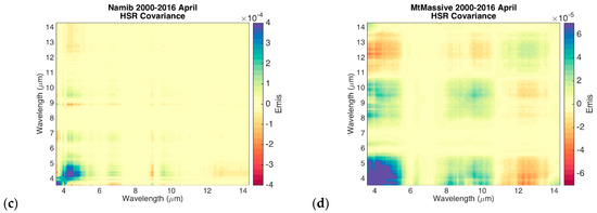 April 2000–2016 CAMEL HSR emissivity covariance for the (a) ARM SGP, (b) Yemen, (c) Namib, and (d) Rocky Mountain, Mt. Massive case site. Corresponding HSR emissivities are shown in Figure 2. Note the scale change for each site.