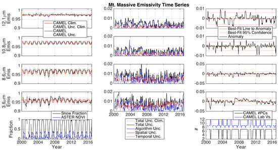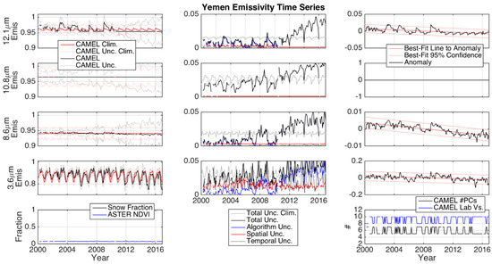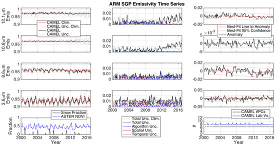 Time series for the same case sites are shown in Figure 4, Figure 5, Figure 6 and Figure 7. The first time series in Figure 4 is for the ARM SGP site. In the top four left hand panels, the monthly CAMEL product time series is overlaid by the climatological CAMEL values for four selected channels at 3.6, 8.6, 10.8, and 12.1 μm. For this case, the monthly product looks quite similar to the climatology—i.e., there appears to be little interannual variability. The middle column shows the monthly emissivity uncertainty time series overlaid by the uncertainty climatology. For the 10.8 and 12.1 μm channels, the monthly total uncertainty increases over the years 2012 through 2016 due to an increase in the algorithm component. (Note the algorithm and total monthly uncertainties are close to equaling each other, so the black and blue lines are mostly overlaid.) This increase in the algorithm component of the emissivity uncertainty is due to an increase in the difference between the ASTER and MODIS MYD11C3 input emissivity over time. This increase in the difference between ASTER and MYD11C3 is due to processing anomalies of the MYD11C3 Col. 4.1 caused by issues with initialization of the algorithm. Meanwhile, the total uncertainty climatology is much more stable but still has distinct seasonal variations. Explanation of the CAMEL uncertainty and its components can be found in Feltz et al. [23]. The right hand top four panels show the emissivity anomalies (i.e., the monthly minus climatological emissivity) overlaid by a best fit trend line with 95% confidence bounds. While the authors chose to compute and show these trends, they are not advertising them as physically meaningful trends—i.e., the trends are frequently affected and caused by known processing anomalies of the MODIS MYD11C3 day/night emissivity algorithm. Since emissivity processing artifacts are subsequently present in the monthly CAMEL emissivity product for some years of the data record, this further motivates the use of the CAMEL climatology, which averages out the slowly varying and spurious processing-induced artifacts. More dramatic examples of processing-induced artifacts are seen in the following case studies.