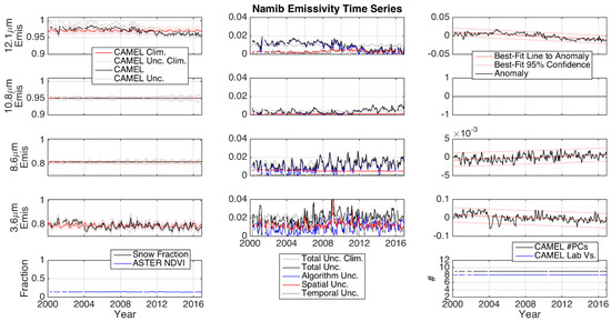 Figure 5 shows the same time series plots for the Namib quartz site. Very little variation is seen from month-to-month and year-to-year in the 8.6 and 10.8 μm channels while the 12.1 μm channel monthly emissivity has a noticeable decrease in emissivity around 2009 which is also seen as a more significant trend in the right column. This discrepancy between the channels is an outcome of the CAMEL method of combining MODIS and ASTER data at different channels as described in Borbas et al. [22]. Specifically, the CAMEL 10.8 μm channel is based solely on ASTER data and the CAMEL 8.6 μm channel is based on a weighted mean of ASTER and UW BF data, where ASTER gets 90% weight in arid regions such as this Namib case site. Meanwhile, the CAMEL 12.1 μm channel is either based solely on UW BF data or is a weighted combination of ASTER and UW BF data where the weights are defined by the difference between the ASTER and UW BF emissivities. Thus, ASTER’s characteristic of being more stable over time is reflected more heavily in the CAMEL 8.6 and 10.8 μm channels. The decrease in the CAMEL 12.1 μm emissivity around 2009 is due to MODIS MYD11C3 processing anomalies that occur after 2009. These anomalies are believed to be due to issues with initialization of the emissivity algorithm.