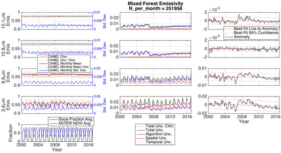 Figure 8 shows results for the IGBP Mixed Forest category, where the number of samples for each month is around 252,000. This category is located predominantly around the high mid-latitudes and is defined to have at least 60% tree cover with both deciduous and coniferous trees contributing to the cover in roughly equal portions. For this category, large annual variations in snow cover are seen, as well as variations in the corresponding ASTER normalized difference vegetation index (NDVI). Time series of the standard deviation of the CAMEL monthly emissivity over IGBP category (seen in left column with right hand axis) shows that the CAMEL emissivity is relatively homogeneous within the Mixed Forest category for the 10.8 and 12.1 μm channels. Seasonal changes in the standard deviation over IGBP category are seen in the 8.6 and 3.6 μm channels and show larger variations in CAMEL emissivity during the months with higher average snow fractions. The largest temporal variations in emissivity are seen in the 3.6 μm channel where the climatological emissivity varies by ~0.015 over the annual cycle. A caveat is added to the interpretation of this result, however, as the change in the 3.6 μm emissivity is likely not explainable by only the changes in phenology of the Mixed Forest category but could be contributed to by the remains of uncorrected solar effects. While seasonal variations are also present in the 8.6 and 10.8 μm channels, they are smaller than those seen at the Mt. Massive site where snow cover also changed dramatically over the annual cycle. This is due to the fact that the background forested ground cover emissivity is closer to the emissivity of snow than is the rocky ground cover found at Mt. Massive. Around the year 2007, a distinct change in the emissivity and uncertainty time series can be seen as a subtle discontinuity. This change in behavior is due to a change in the MOD11C3 Col. 4.1. algorithm—prior to the year 2007, the algorithm used the Col. 4 cloud mask, and after January 2007 it used the Col. 5 cloud mask. Again, the climatology averages this effect out and shows a more realistic characterization of the dataset.