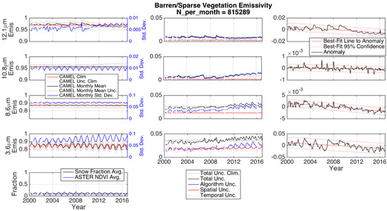 Results for the Barren and Sparse Vegetation IGBP category are shown in Figure 9. This category is dominated by the following geographic regions: the Sahara Desert, the Arabian Peninsula, Iran and surrounding regions, and the Taklamakan and Gobi Deserts north of the Tibetan Plateau. Similar to the Mixed Forest category, the 10.8 and 12.1 μm channel monthly IGBP mean emissivity seems to represent all spectra within the category quite well—the standard deviation of the emissivity over the IGBP category is contained under ~0.01 for all months and years. The 8.6 and 3.6 μm channel emissivity, however, is much more variable within a given single month for the IGBP Barren and Sparse Vegetation category, with standard deviations as high as ~0.1, ten times greater than at 10.8 and 12.6 μm. This is anticipated for desert scenes and is explained by the large spectral contrast that exists between the bare soil cover and vegetation. Minimal temporal variations are now seen in the quartz sensitive 8.6 μm and 10.8 μm channels. Somewhat sporadic temporal variations are seen in the 12.1 μm channel, as was seen in the Yemen case site time series. These temporal variations are likely due to undetected cloud cover over snow-free surfaces, which the 12.1 μm channel is typically sensitive to. This is supported by the fact that similar features are seen in the emissivity uncertainty, particularly the algorithm component, which imply that these sporadic variations are due to processing artifacts in the MODIS MOD11 emissivity processing. Again, the trends show decreasing emissivity over the CAMEL record but are likely induced by processing artifacts. The climatology for this case offers a more stable emissivity than the monthly product.