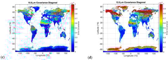 The diagonal of the CAMEL covariance for the month of April at (a) 4, (b) 8.5, (c) 10.8 and (d) 12 μm. The covariance diagonal is computed at 0.25 degree resolution and is available as part of the RTTOV CAMEL V002 climatology emissivity dataset. Note the color scale change between subplots.