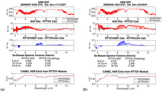 Comparison of IASI BTs calculated using the current RTTOV emissivity module (“RTTOV2007”) and the updated module (“RTTOVclim”) for the ARM SGP site on (a) May 7th, 2009 at 03:38 UTC and (b) on May 30th, 2009 at 16:22 UTC. Top panel shows the RTTOV calculated BTs overlaid for each emissivity module, second from top panel shows IASI observed minus calculated BT again overlaid for each emissivity module (RTTOVclim curve in red is overlaying the RTTOV2007 curve in black), third panel from top shows calculation differences, bottom panel shows the RTTOV CAMEL emissivities overlaid. The de-biased spectral variances are listed in Kelvin2 for each observation minus calculation difference for three spectral regions. Solar zenith angle is noted in the top title.