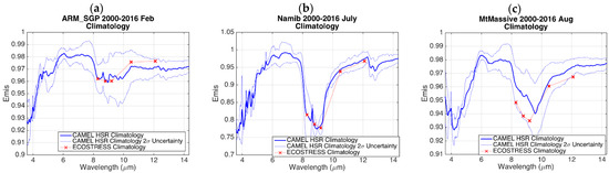 CAMEL HSR climatology (solid blue line) with the 2 sigma uncertainty estimate (dotted blue lines) overlaid by ECOSTRESS (red crosses) emissivity. ECOSTRESS follows the CAMEL climatology very closely over (a) ARM SGP in the month of February, and (b) the Namib site in the month of July. At (c) Mt. Massive, ECOSTRESS emissivity is significantly lower than the CAMEL climatology, potentially due to small changes in landcover over a heterogeneous site, since the two measurements do not overlap temporally.