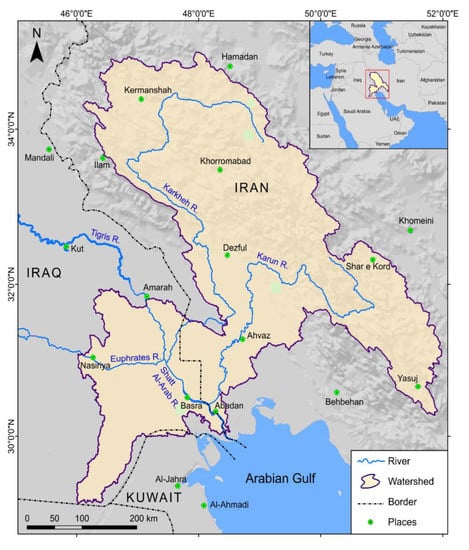 - UN-ESCWA and BGR (United Nations Economic and Social Commission for Western Asia; Bundesanstalt für Geowissenschaften und Rohstoffe). Inventory of Shared Water Resources in Western Asia. Beirut. Available online: https://waterinventory.org/sites/waterinventory.org/files/chapters/Chapter-05-Shatt-al-Arab-Karkheh-and-Karun-Rivers-web_0.pdf (accessed on 6 December 2020).