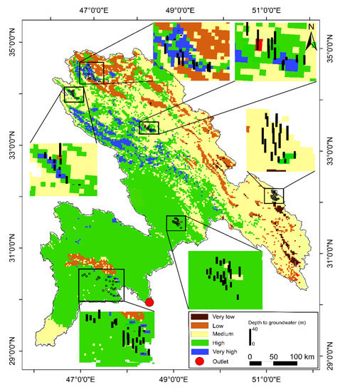 The prospective zones of groundwater delineated by RS-GIS techniques are typically verified by comparison with existing borewells data. In the current study, however, such data are not available. Alternatively, depth to groundwater data were extracted from the peer-reviewed literature [138,139,140,141,142,143] for 99 wells distributed throughout the basin. We performed a comparative analysis between the depth to groundwater and the potential zones. The map of wells was projected on the GWPZs map to verify the effectiveness of the RS-GIS and AHP-based method in demarcating GWPZs in the study area.