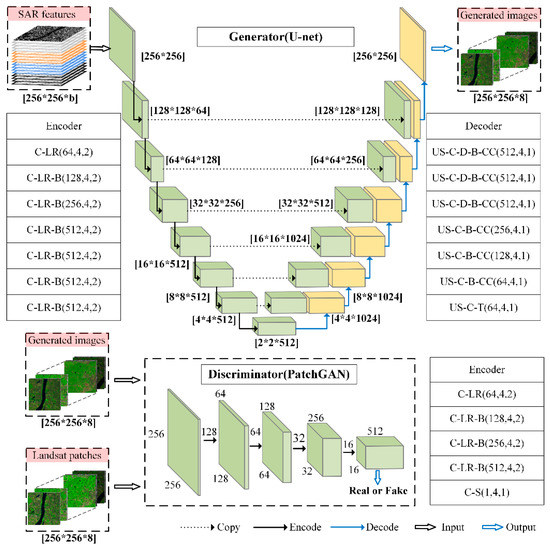 We adapted the pix2pix network architectures [48] to be compatible with multi-spectral optical images, as well as either one-channel (VV or VH) or two-channel (VV and VH) SAR images. Pix2pix, as a widely-used image-to-image translation network architecture, has proven stable and powerful for image-to-image translation [72,74]. It makes it possible to create various images without specialized knowledge of the images that we want to make [38]. In particular, the generator adopted the U-Net [75] architecture, consisting of seven convolution layers for encoding and seven deconvolution layers for decoding. In contrast, the discriminator adopted the PatchGAN architecture, consisting of five convolutional layers, followed by a sigmoid output layer for classification. The detailed information is shown in Figure 3. The inputs of the generators were SAR images, and the discriminators were either SAR images or optical images. The outputs of the generators were the generated optical images. For VV and VH polarization modes, the size of the input of the generator was set to 256 × 256 × 17, whereas for the VV&VH polarization mode, the size of the input of the generator was set to 256 × 256 × 34. The output of the generator was set to 256 × 256 × 8 and the size of the input of the discriminator was set to 256 × 256 × 16.