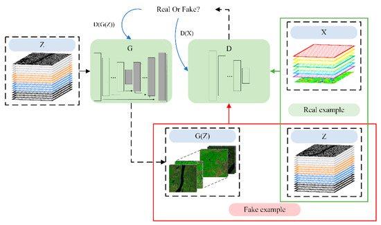 Training process of the proposed method. G: generator; D: discriminator; Z: SAR features; X: Landsat features; G (Z): image generated by the generator; D(G(Z)): feedback from the fake example; D(X): feedback from the real example. The red box denotes the training setup for fake examples (generated images, SAR patches) as the input, and the green box denotes the training setup for real examples (Landsat patches, SAR patches) as the input.