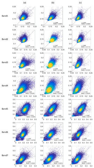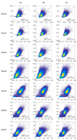 In this experiment, we compare the optimal polarization of the three polarization modes in two cases: (1) using both textural information and edge information as the input and (2) using only textural information as the input. To quantitatively assess the accuracy of the images generated by the different polarization modes, we employ the r and RMSE values between the predicted reflectance and real reflectance. To display the result clearly, we employ a scatter diagram to show the density distribution of data using MATLAB. The scatter diagram shows the reflectance relationship between the generated values and the actual values of the Landsat image, where the line in the scatter diagram is the 1:1 line. Points that are close to the line indicate that the algorithm can capture the reflectance change in surface objects and achieve high accuracy in predicting the reflectance of pixels. The yellow color indicates high centralization of points.