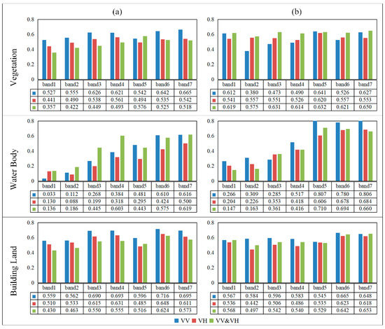 Correlation bar chart of each band under different polarization modes: (a) without edge information, (b) with edge information. The horizontal axis represents the different bands and the vertical axis represents the correlation coefficient.