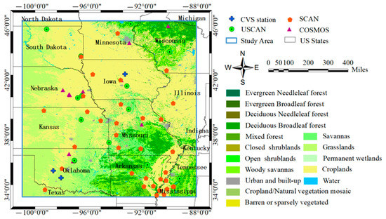 Figure 1 presents the spatial distribution of the in-situ SM observation stations and the study area. It is located in the central United States. The landform of the study area is characterized by a broad expanse of flat land. It has semi-arid continental climate. The dominant land covers include prairie, steppe, and grassland.