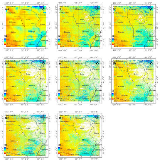 Original and downscaled SM (cm3/cm3) on July 27, 2016, where (a) is original 36 km SM; (b–h) are the downscaled results with Test1 to Test7, respectively.