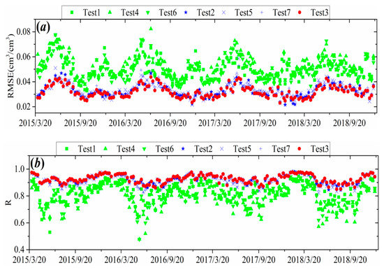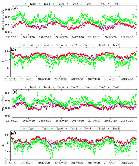 Figure 3 presents the statistics of the difference between original SM and aggregated SM during the whole study period from 2015 to 2018. The indicators RMSE and R were utilized. The greater R and smaller RMSE indicate better performance of the downscaled SM as compared with the original SM. Therefore, we can arrange the various downscaled SM according to the mean of numerous RMSE and R over the whole study period. For RMSE, Test3(0.032) < Test2(0.033) = Test5(0.033) < Test7(0.034) < Test6(0.050) = Test1(0.050) < Test4(0.053). For R, Test3(0.927) > Test2(0.926) > Test5(0.919) > Test7(0.918) > Test1(0.821) > Test6(0.811) > Test4(0.786). The results indicate that Test3 has the best performance, which integrates all of the downscaling factors. Test2, Test5, and Test7 belong to the second tier, which all integrate the geographical indicators. The remaining Test1, Test4, and Test6 are in the third tier, where the geographical indicators are not taken into account. Within the third tier, Test1 and Test6 present very similar performance with the same RMSE and close R. We can also find this phenomenon within the second tier, showing that Test2 and Test5 or Test7 have very similar performance. It should be noted that the only difference between Test1 and Test6 is the difference between LST and LEE. From this mass conservation analysis, we found that adding geographical factors could improve the performance of downscaling SM significantly. We also found that LST and LEE are comparative as downscaling factors. Certainly, more comparisons are required especially the comparison against in-situ SM.