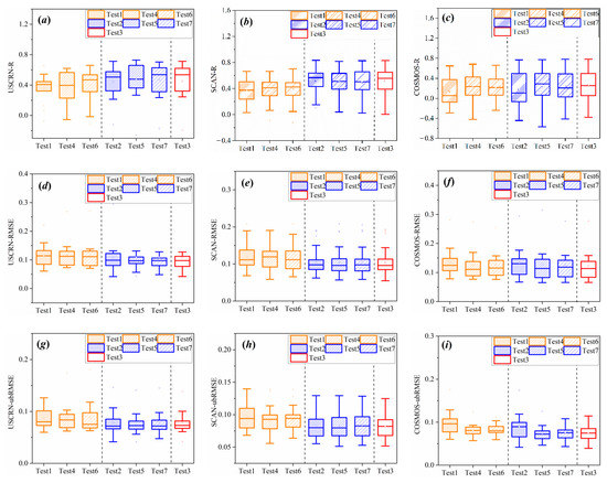 Figure 4 employed box plots to present the comparisons of various downscaled SM with in-situ SM at sparse networks. The above-mentioned hierarchical relationship still exists in the comparisons against these in-situ SM at sparse stations. Taking the results at SCAN for example, we could clearly distinguish the third tier (Test1, Test4, and Test6) from the other experiments. However, the hierarchical relationship is marked at the sparse networks of USCRN and SCAN better than that at the sparse network of COSMOS. This may be because COSMOS probes measure SM at the depths of decimeters [38]. In contrast, the SM observations of SCAN and USCRN at the depth of 0.05 m were employed in this study and this depth has well consistency with the depth of SMAP SM.