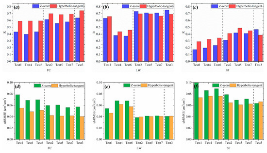 Comparison of Z-score normalization against hyperbolic-tangent normalization at three CVS stations where (a–c) are R values and (d–f) are ubRMSE values at FC, LW, and SF, respectively.