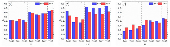 Comparison of SVR method against FNN method at three CVS stations where (a–c) are R values and (d–f) are ubRMSE values at FC, LW, and SF, respectively.