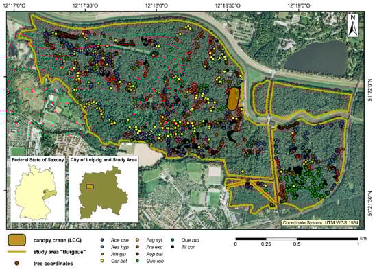 The study site Burgaue is located within the city boundaries of Leipzig (Saxony, Germany) and covers a total area of 2.18 km2 (see Figure 1). Situated in the floodplain of the Elster, Pleiße, and Luppe rivers, the Leipzig floodplain forest is one of the largest floodplain forests in Central Europe [38]. Leipzig lies in the transient zone of maritime and continental climate that is characterized by warm summers and an annual mean temperature of 8.4 °C with annual precipitation of 516 mm [39]. The study site is covered with a species-rich and structurally complex hardwood floodplain forest with European ash, English oak, Sycamore maple, European hornbeam, and Small-leaved lime being the dominant tree species [40]. Forest inventories provided species information and exact geolocation of a total of 1702 trees in the upper tree layer (Figure 1). Within the study site, a crane facility (Leipzig Canopy Crane facility, LCC) for the investigation of forest tree canopies was established in 2001. The crane facility covers a total area of 1.65 ha (Figure 1) and allows access to about 800 trees with a diameter at breast height (DBH) greater than 5 cm belonging to 17 different species, with Sycamore maple, European ash, and Small-leaved lime being the most dominant ones [41].