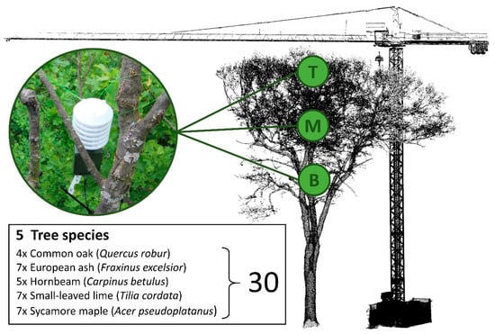 Temperature is a key environmental variable affecting physiological processes of plants [1,2] and a variety of biogeochemical cycles in forest ecosystems [3,4,5]. However, forest canopies are often decoupled from their surrounding with substantial deviations between ambient air temperature and temperatures within and below the canopy [6,7,8,9]. The magnitude of those microclimatic variations depends on meteorological and environmental conditions but is also strongly modulated by stand structure [10,11,12], tree species composition [3], physiological and structural characteristics related to tree species identity [13], and resulting changes in canopy albedo [14,15]. Differences in the canopy microclimate may determine the diversity of ecological niches in tree crowns, and with this diversity of floristic and faunistic communities [16,17], they control tree phenology [18], regulate photosynthesis [19] and feedback on transpiration rates [20], and thus affect tree health. Monitoring spatiotemporal variations in canopy temperature related to tree species identity is not only crucial to characterize forest functioning, but would also allow predicting the context-dependent cooling potential of different tree species, which would foster the development of strategies to mitigate climate change effects in urban and forest environments [8,9]. However, the acquisition of ground-based temperature measurements is challenging due to the restricted access to tree canopies [21]. Data on tree species-specific air temperature are rare and, due to the lack of repeated measurements, not suitable for studying spatial or temporal patterns of interspecific variations in canopy temperature. There is thus an urgent need for spatially replicated long-term measurements of within-canopy air temperature variations between different tree species [13].