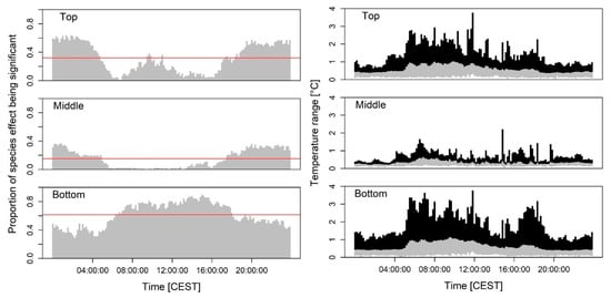 Aggregated model results analyzing tree species effects for the 13,248 single 10-min intervals between 1 July and 30 September in 2016. Proportion of significant species effects on air temperature for top, middle, and bottom sensor positions (left; red lines indicate the mean probability over all single time steps), as well as the temperature range between tree species with highest and lowest air temperatures (right; black indicates maximum, grey the mean, and white the minimum range for each time interval).