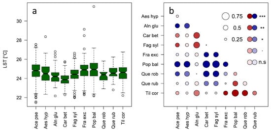 (a) Observed species-specific differences obtained from gyrocopter LST data with a pixel size of 0.4 m, (b) results from the spatial autocorrelation (SAC) model showing a pairwise comparison of fine-scale tree species surface temperatures as obtained from the SAC model (gyrocopter data, 0.4 m pixel size; reference species at the x-axis—higher surface temperatures of tested species compared to the reference species in red, lower temperatures in blue). The diameter of circles is related to the magnitude of species difference in °C and the color gradient indicates the level of significant species differences (n.s. p > 0.05, * p < 0.05, ** p < 0.01, *** p < 0.001).