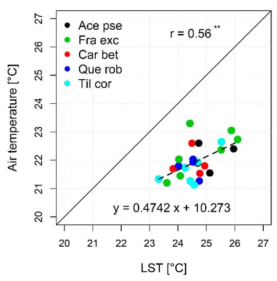 Relationship between tree crown air temperature and gyrocopter LST at 0.4 m resolution (n = 25); asterisk indicates the significance of the correlation (** p < 0.01).