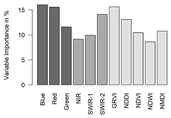 Random forest-based variable importance from model calibration at the 100 m level calculated as the increase in MSE (%) in prediction using variable permutation. Spectral bands of the VIS to SWIR region are represented in dark to medium gray, and spectral indices in light gray.