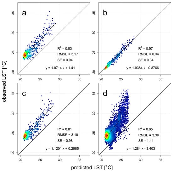 Statistical relationship between (a) gyrocopter LST and Landsat 8 LST at the 100 m level, (b) predicted LST using the random forest (RF) model and Landsat 8 LST at the 100 m level, (c) predicted LST using the RF model and gyrocopter LST aggregated to the 100 m level, and (d) Landsat 8 LST downscaled to the 30 m level and gyrocopter LST aggregated to the 30 m level.