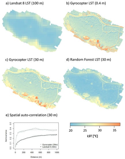 As indicated by the analysis of the empirical semivariogram (Figure 8e), we overall found the spatial autocorrelation structure inherent in the gyrocopter data at the 30 m level to have an effective range (distance at 95% silt) of 210 m. For the downscaled LST product, the effective range of the spatial autocorrelation was, with 4264 m, found to be higher. The lower level of semivariance at a lag distance of 30 m observed for the downscaled LST product additionally indicates a reduced thermal contrast, compared to the gyrocopter data at the 30 m level.