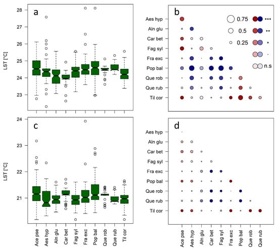 (a) Observed species-specific differences obtained from gyrocopter LST data with a pixel size of 30 m in comparison to (c) the downscaled Landsat 8 product. Results from the SAC model showing a pairwise comparison of fine scale tree species surface temperatures, as obtained from the SAC model using (b) gyrocopter LST data aggregated to a pixel size of 30 m and (d) the downscaled Landsat 8 product data. Reference species at the x-axis—higher temperatures of tested species compared to the reference species in red, lower temperatures in blue. The diameter of circles is related to the magnitude of species difference in °C, and the color gradient indicates the level of significant species differences (n.s. p > 0.05, * p < 0.05, ** p < 0.01, *** p < 0.001).