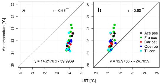 Relationship between tree crown air temperature and (a) gyrocopter LST at 30 m resolution, and (b) the downscaled Landsat 8 product (n = 25); asterisk indicates the significance of the correlation (** p < 0.01, *** p < 0.001).